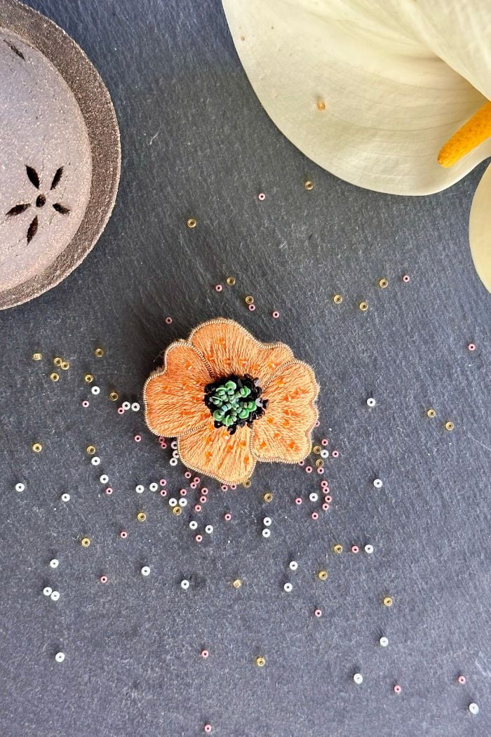 Apportez du volume et de la prestance à vos tenues avec cette broche coquelicot de la collection Poppelicot, entièrement brodée à la main de fils de soie, perles et jaseron. Chaque pétale est soigneusement façonné pour créer un effet en volume, accentué par un cœur en relief orné de paillettes. Cette broche capture la beauté et la force éphémère du coquelicot tout en ajoutant une touche éclatante et sophistiquée à votre style.