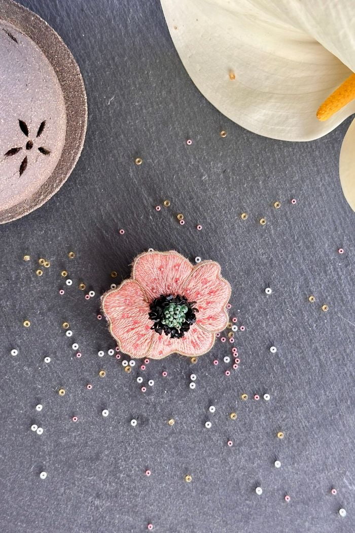 Apportez du volume et de la prestance à vos tenues avec cette broche coquelicot rose de la collection Poppelicot, entièrement brodée à la main de fils de soie, perles et jaseron. Chaque pétale est soigneusement façonné pour créer un effet en volume, accentué par un cœur en relief orné de paillettes. Cette broche capture la fragile beauté et la force du coquelicot tout en ajoutant une touche éclatante et sophistiquée à votre style.