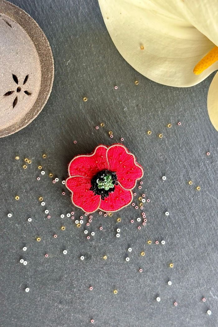 Apportez du volume et de la prestance à vos tenues avec cette broche coquelicot rouge de la collection Poppelicot, entièrement brodée à la main de fils de soie, perles et jaseron. Chaque pétale est soigneusement façonné pour créer un effet en volume, accentué par un cœur en relief orné de paillettes. Cette broche capture la beauté fragile et la force du coquelicot tout en ajoutant une touche éclatante et sophistiquée à votre style.
