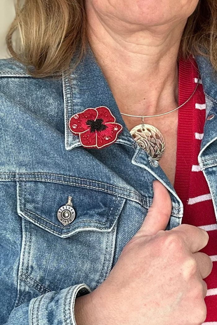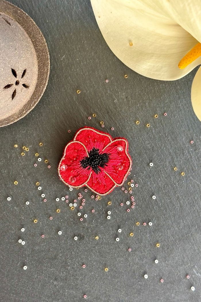 Ajoutez une touche d’élégance et d’originalité à votre style avec cette broche coquelicot brodée à la main, symbole de force et de fragilité, de délicatesse et de beauté éphémère. Chaque fleur est minutieusement brodée à l’aiguille avec du fil de soie et du fil métallisé, finement bordé de jaseron, apportant éclat et texture. Les perles de verre assorties enrichissent les détails, tandis que le cœur du coquelicot, fait de perles de verre noires, capture l’essence de la fleur avec finesse.